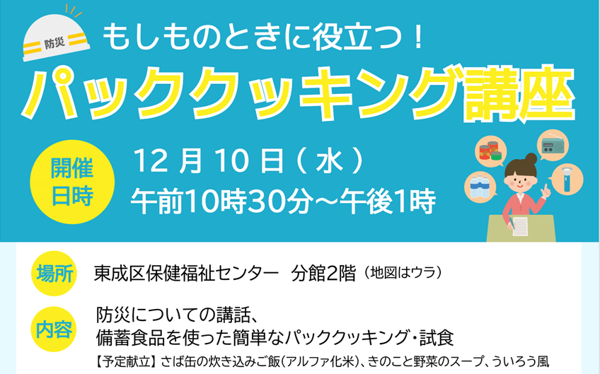 【大阪市東成区】災害時に役立つパッククッキング講座が開催されます!
