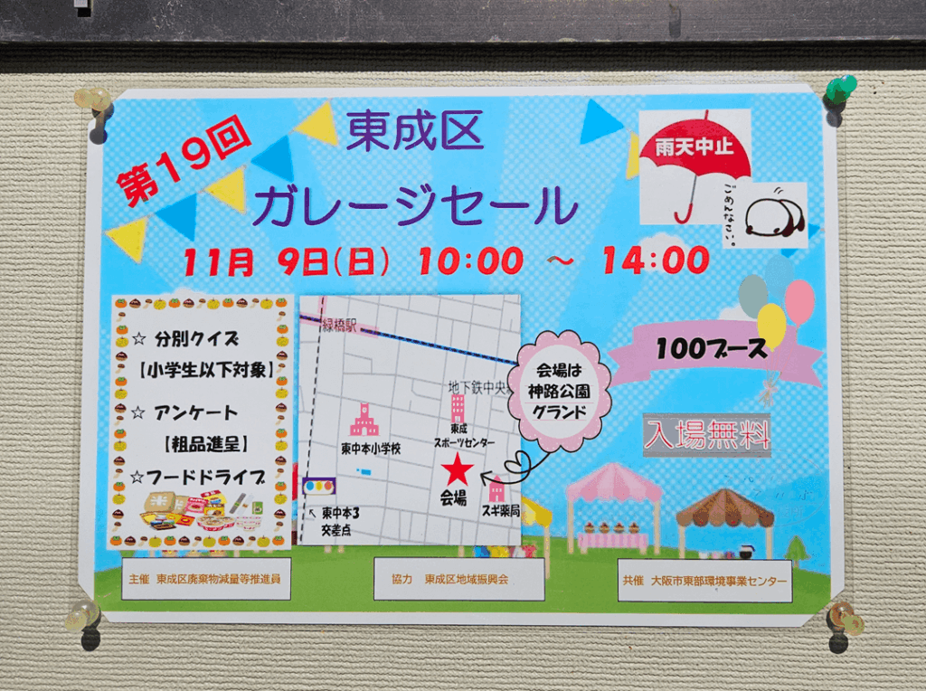 大阪市東成区の神路公園グランドで「第19回東成区ガレージセール」が開催されます。 開催日時は、2025年11月9日(日)午前10時から午後2時まで。 このイベントは、ごみ... -