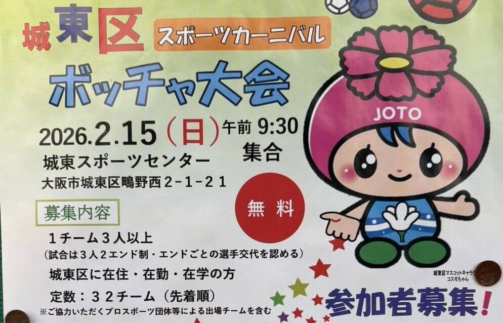 城東区スポーツセンターで、来年2月にボッチャの大会が開催されるようです。 街中の掲示板にもポスターが貼り出されていて、地域の年齢問わず参加できるイベントのよう... -