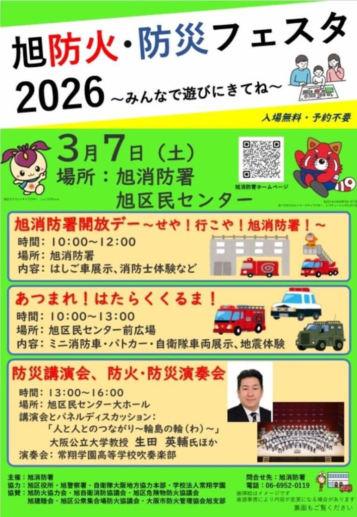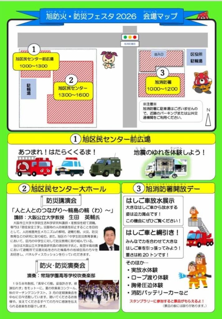 | イベント内容 | ・旭消防署開放デー 時間:10:00〜12:00 場所:旭消防署 内容:はしご車放水展示、はしご車綱引き、実放水体験、ロープ渡り体験、胸骨圧迫体験、消防バッテリーカー など ・あつまれ!はたらくくるま! 時間:10:00〜13:00 場所:旭区民センター前広場 内容:ミニ消防車・パトカー・自衛隊車両展示、地震体験(起震車) ※スタンプラリーあり(景品は数量限定) ・ 防災講演会・防火防災演奏会 時間:13:00〜16:00 場所:旭区民センター大ホール 講演テーマ:「人と人とのつながり ~輪島の輪(わ)~」 講師:大阪公立大学 教授 生田英輔氏ほか 演奏:常翔学園高等学校吹奏楽部 |