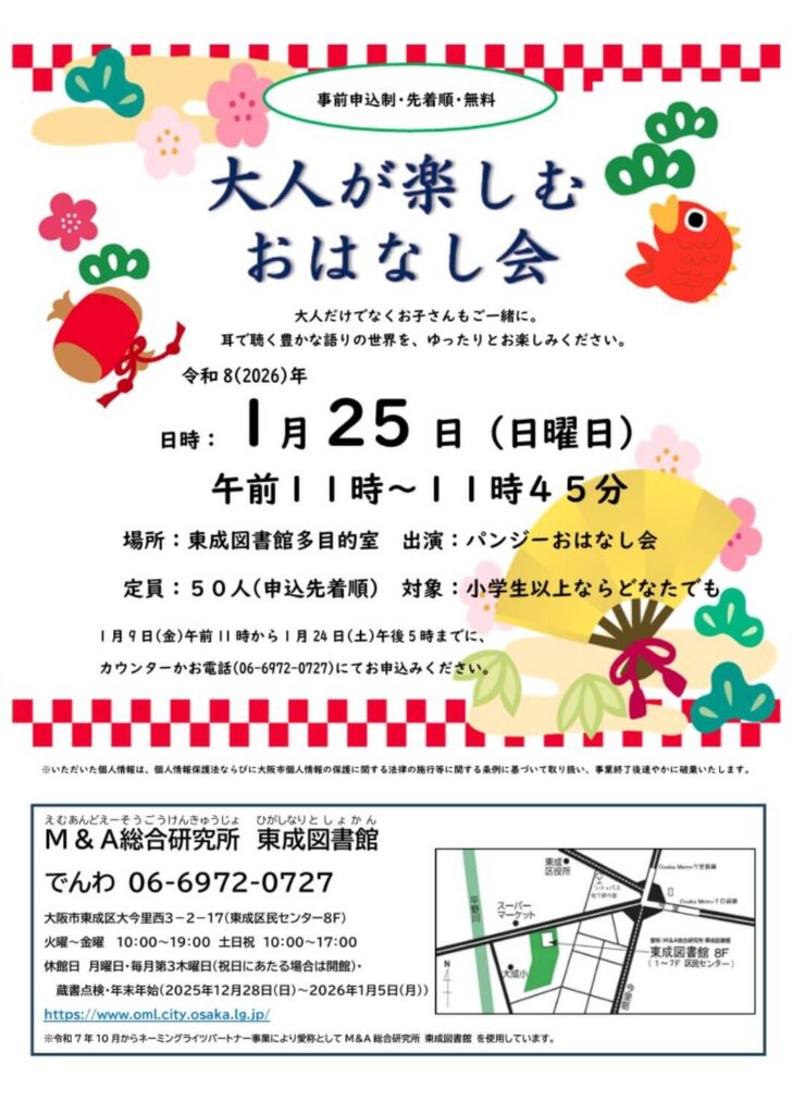 2026年1月25日(日)、大阪市東成区にある東成図書館で「大人が楽しむおはなし会」が開催されます。
