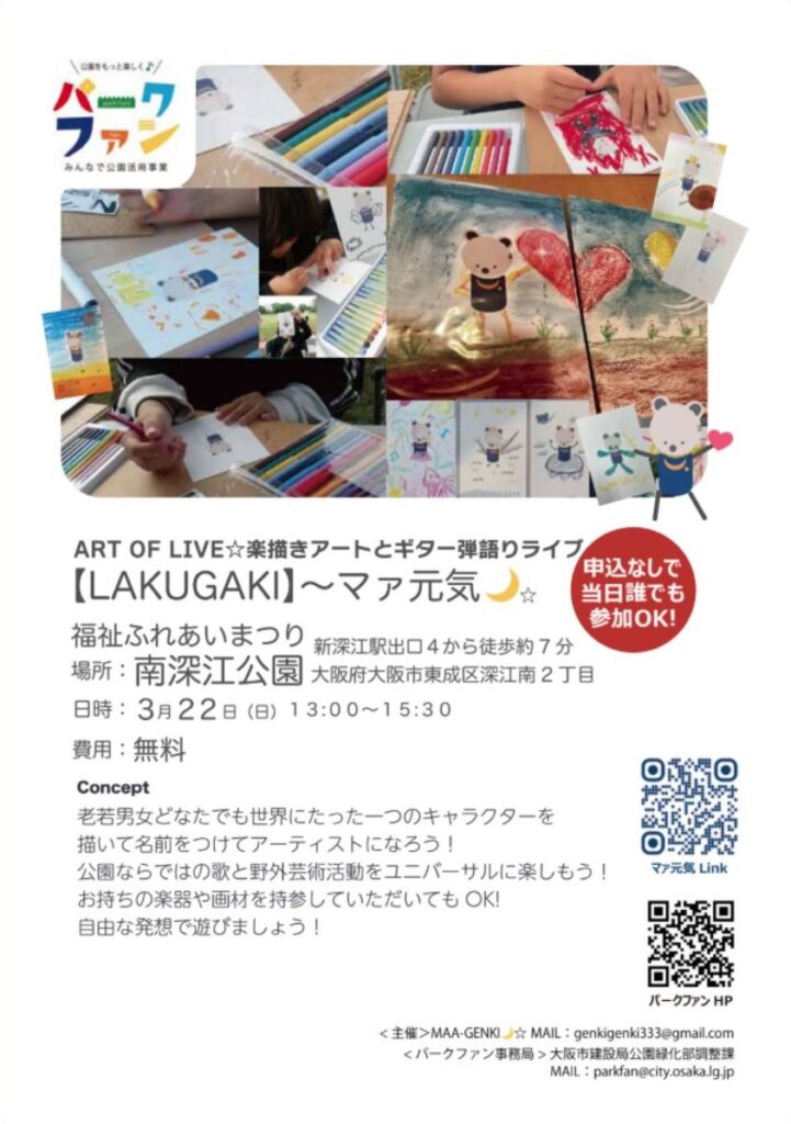 2026年3月22日(日)、大阪市東成区にある 南深江公園 にて「ART OF LIVE☆楽描きアートとギター弾語りライブ」が行われます。