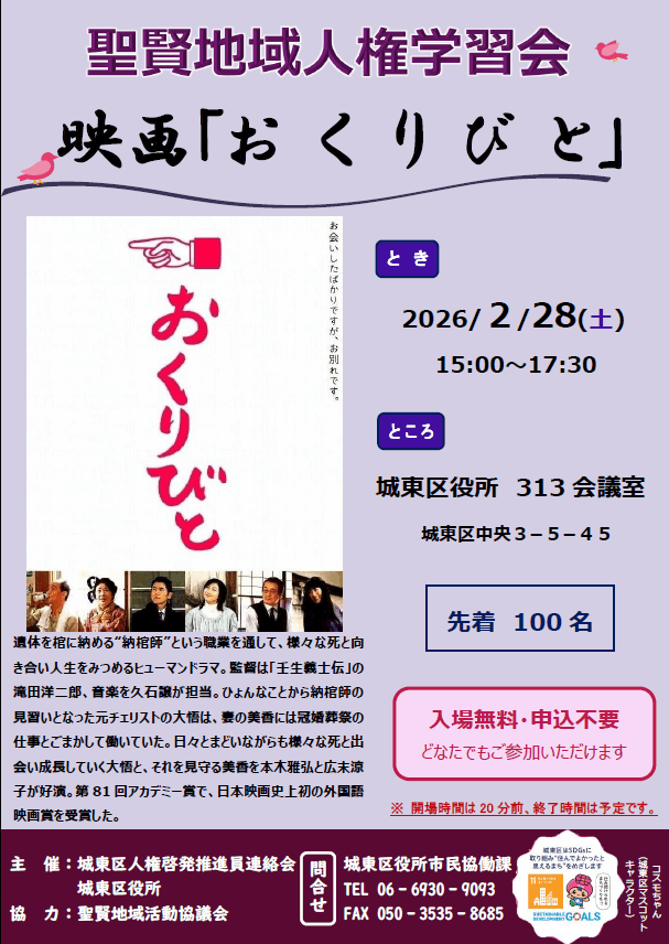 主催は城東区人権啓発推進員連絡会で、聖賢地域人権学習会の一環として行われる催しです。