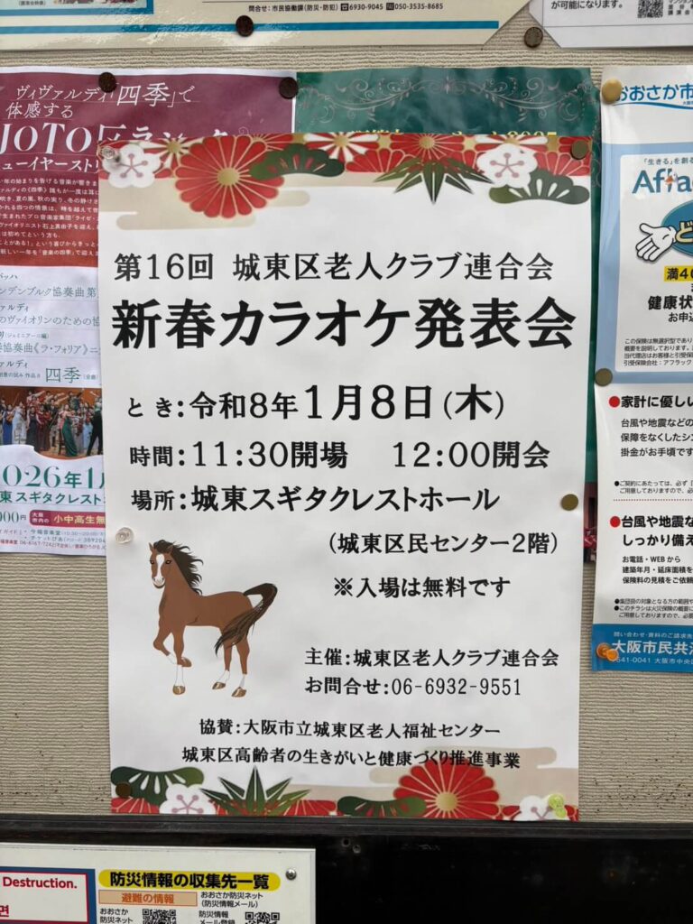 2026年1月8日、城東区老人クラブ連合会による「新春カラオケ発表会」が開催されるようです。