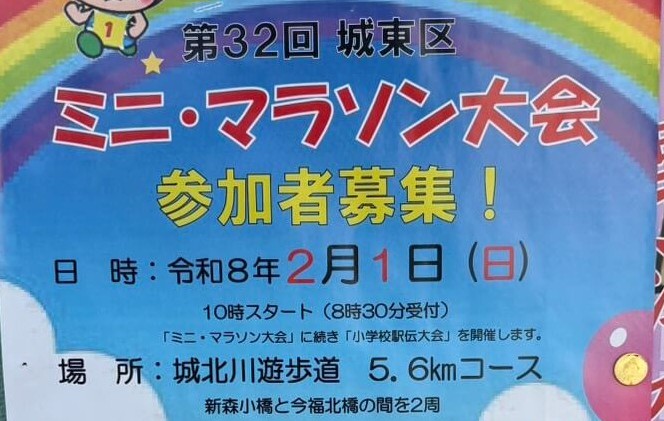城東区では今年も、子どもたちの冬の大イベント「第32回 ミニ・マラソン大会」が開催! 開催日は 2026年2月1日(日)。会場は 城北川遊歩道間を2往復の5.6kmコース とな...