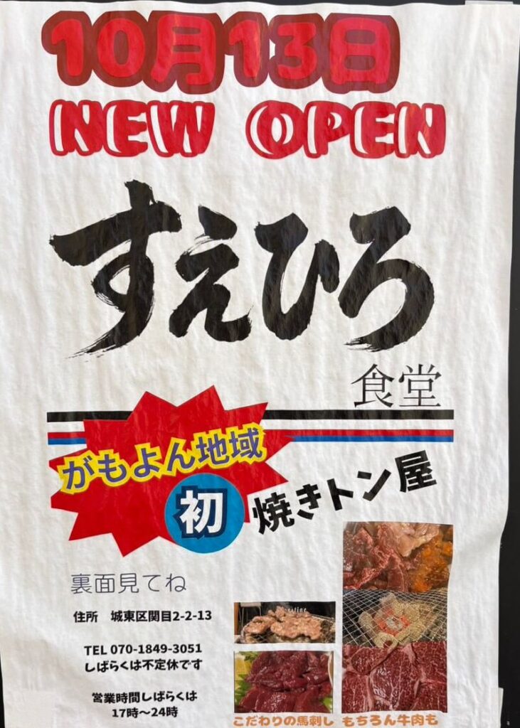 2025年10月13日に城東区関目に焼き肉屋「すえひろ食堂」がオープン。 偶然関目周辺に訪れた際、扉に新店舗オープンの文字を発見!お店は「がもよん地域」にあり、場所は...