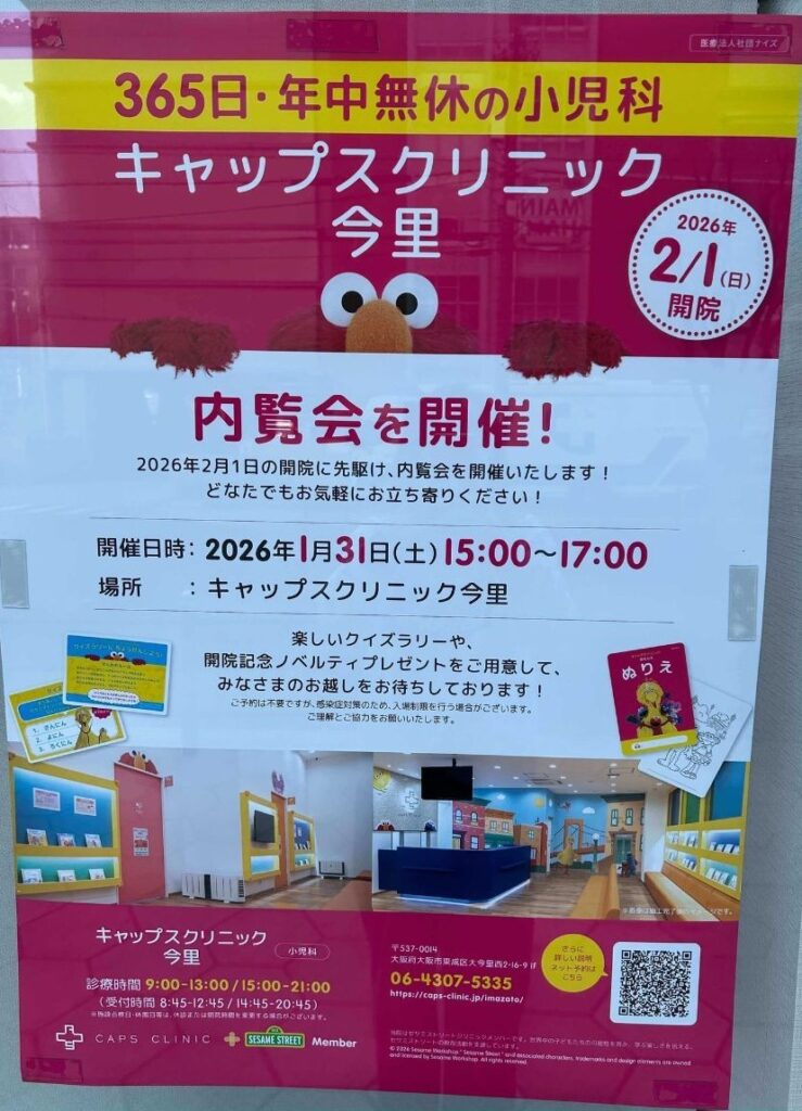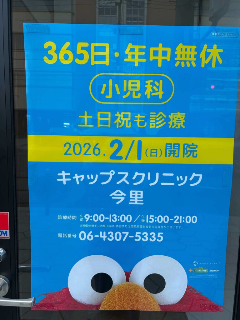 今里エリアに、新しい小児科クリニックができるようです。場所は大今里西、東成区民センター向かいのクリニックモール1階に「キャップスクリニック今里」が2026年2月1日(日)に開院予定とのことです。