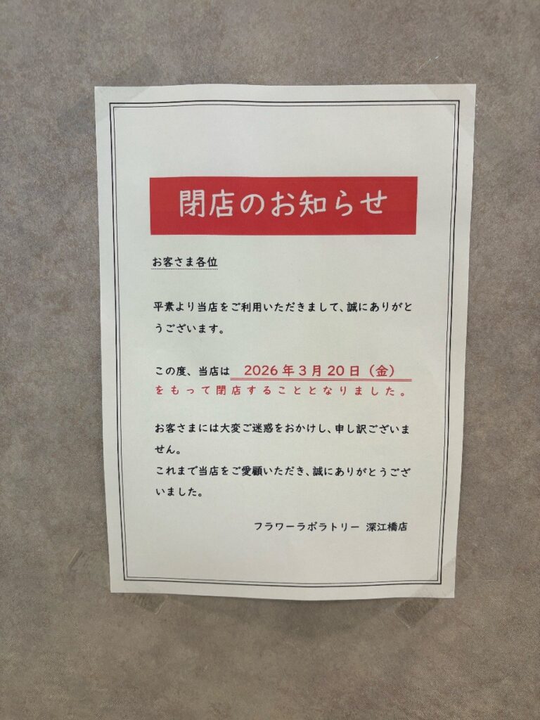 フレンドタウン深江橋にあった花屋「フラワーラボラトリー 深江橋店」が閉店していることがわかりました。