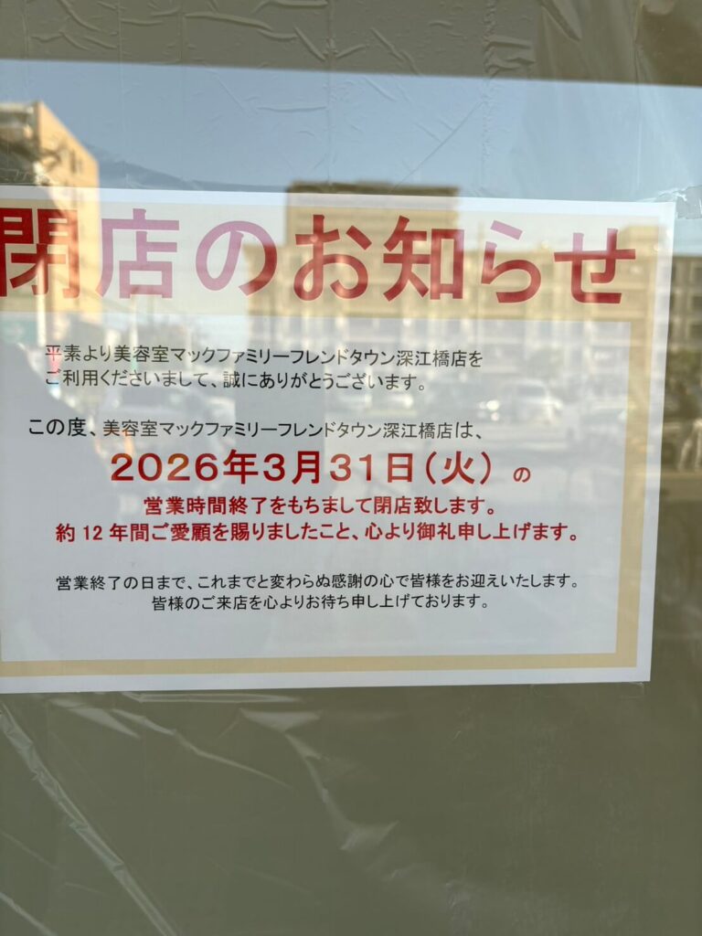 深江橋の平和堂(フレンドタウン深江橋)1階で営業していた「美容室マックファミリーフレンドタウン深江橋店」に動きがありました。