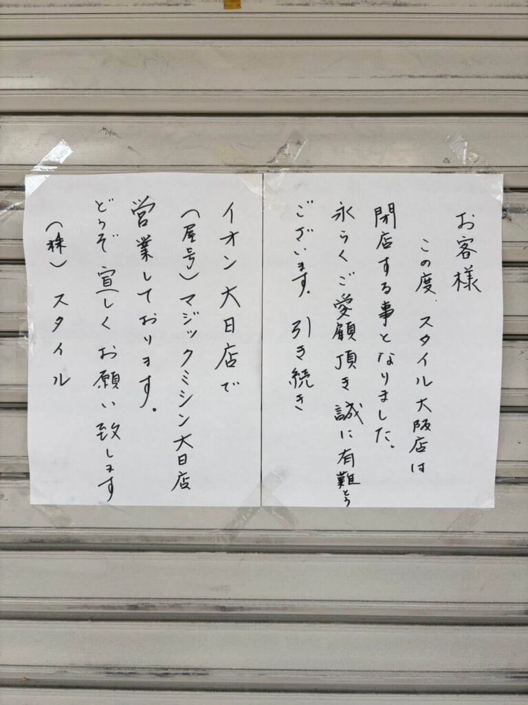 お店のシャッターには手書きの案内があり、「スタイル大阪店は閉店することになりました」と書かれています。