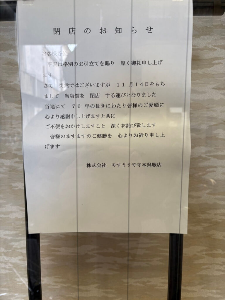 やすうりや寺本呉服店は、商店街の中心部で和装・きもの・和装小物などを扱う専門店として営業を続けてきました。落ち着いた店構えと看板が「商店街の風景」として記憶されていた同店の閉店は、長きにわたる歴史に区切りをつける形となりました。