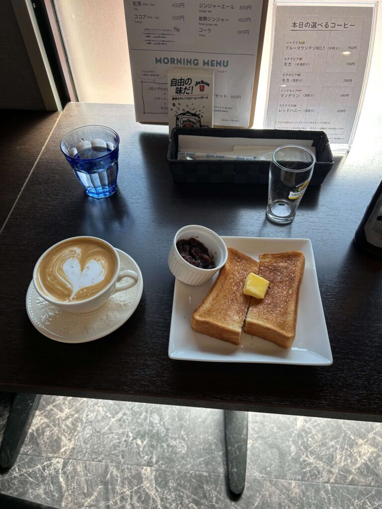 今回はトーストにあんこが添えられたモーニングとカフェラテを注文。ラテにはハートのラテアートが施されており、朝から少し嬉しくなる一杯でした。