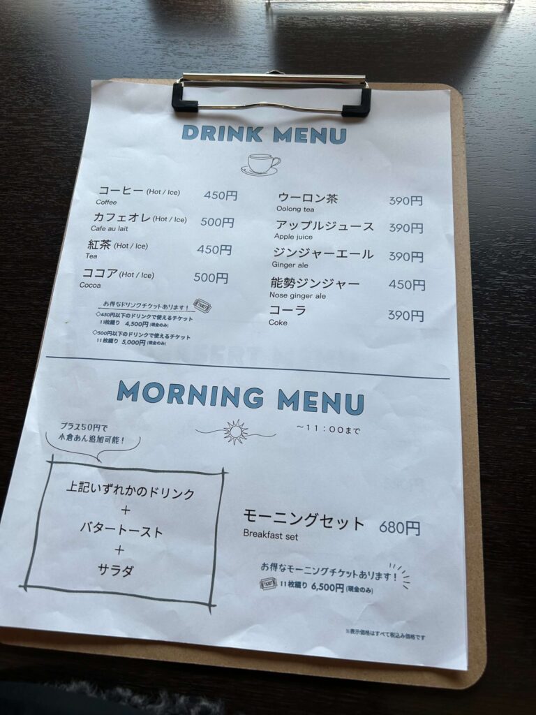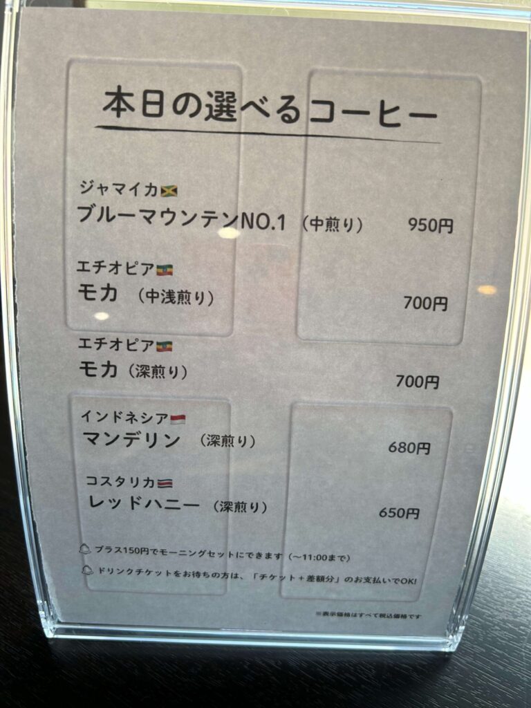 コーヒーは「本日の選べるコーヒー」として数種類が用意されており、ブルーマウンテンNo.1やモカ、マンデリンなどから選べる本格的なラインナップ。好みに合わせて選べるのもポイントです。