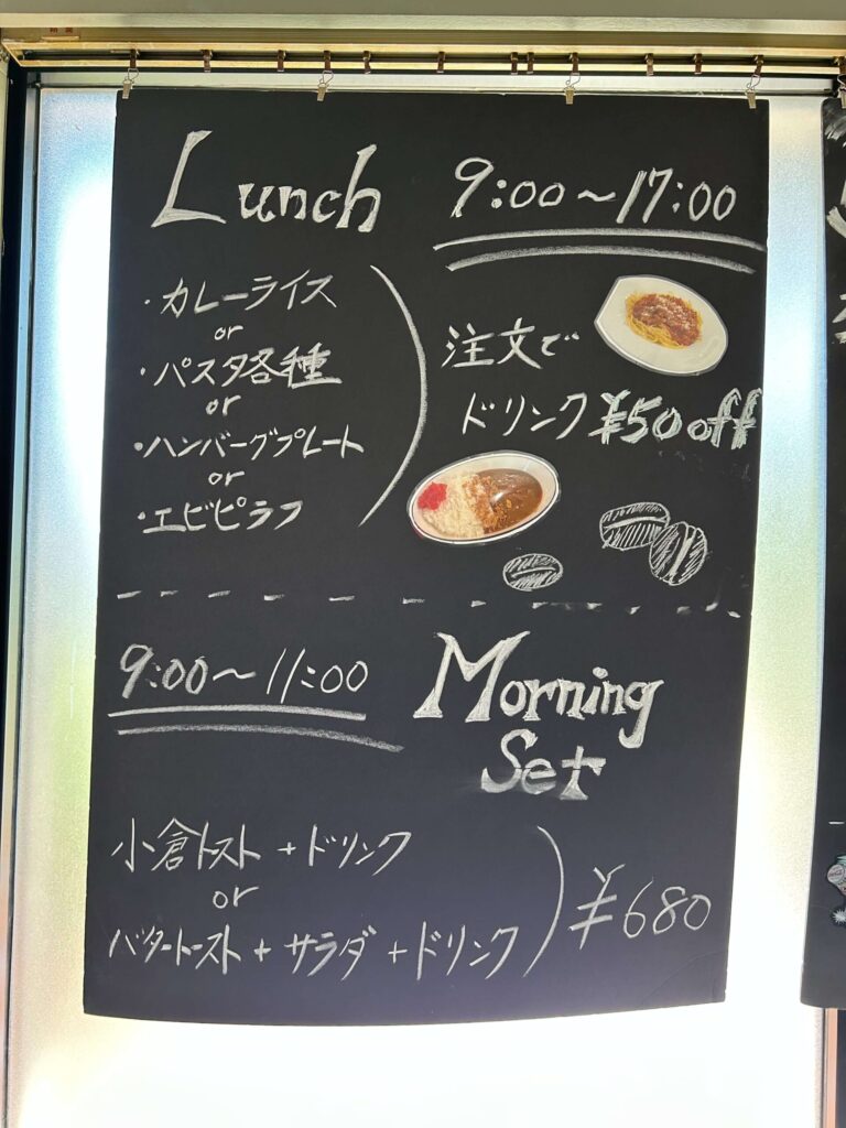 ランチタイム(9:00〜17:00表記の黒板あり)には、カレーライス、パスタ各種、ハンバーグプレート、エビピラフなどしっかりした食事メニューも提供されており、注文するとドリンクが50円引きになるサービスもあるようです。