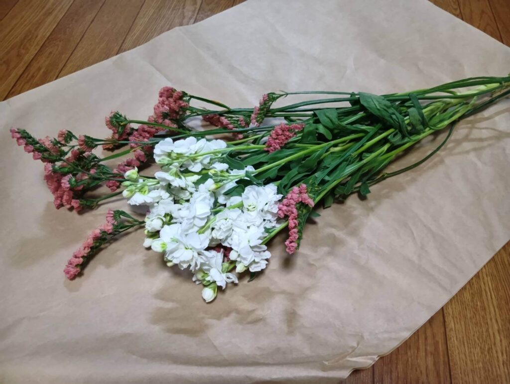 少し変わった花色のスターチスと、入荷したばかりだという白いストックを選びました。