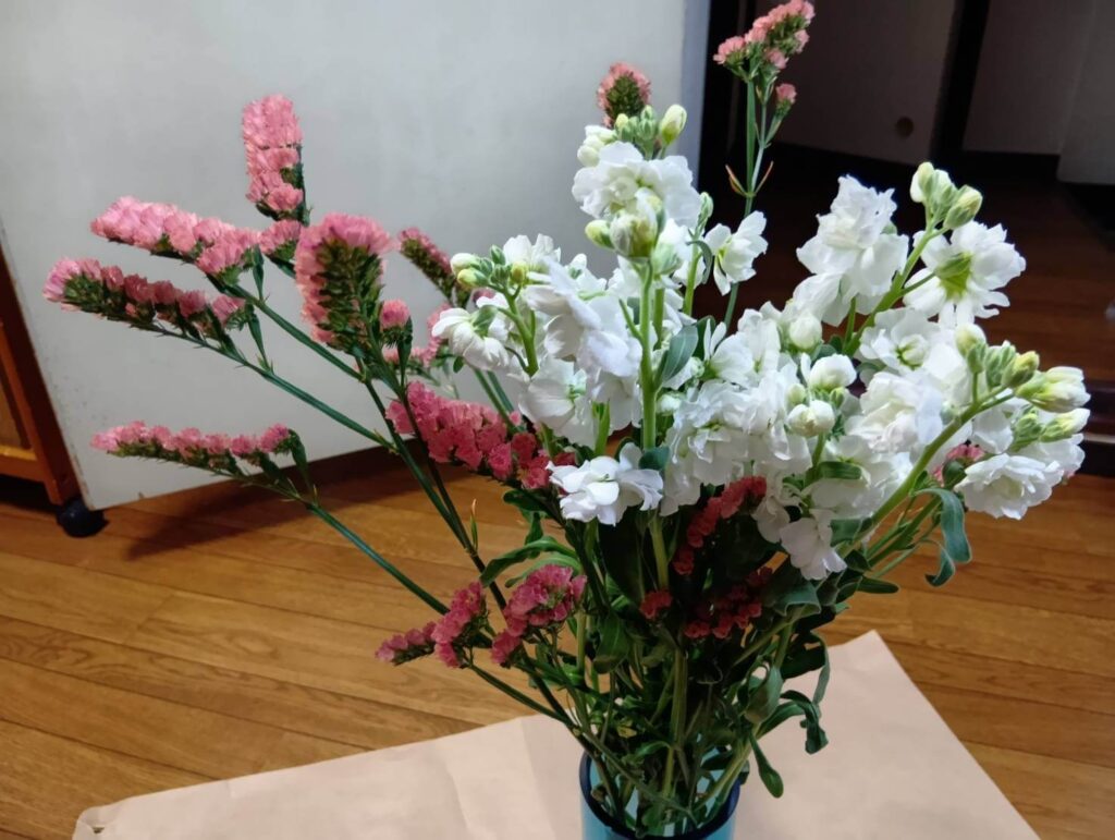 スターチスの花言葉は「変わらぬ心」「永久不変」ドライにしても色が残る花らしい意味を持ち、白いストックとの組み合わせもどこかしっくりきました。