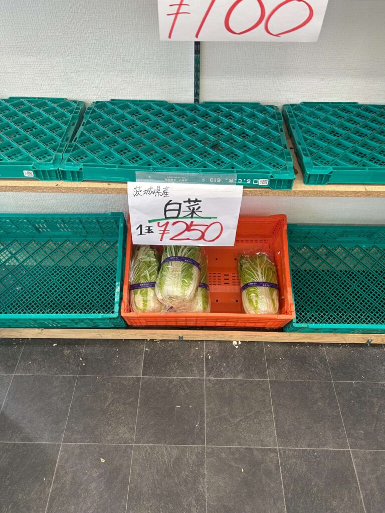 並んでいるのはフルーツだけでなく野菜もあり、バナナ100円、キャベツ100円など、どれも税込価格でかなりお手頃。